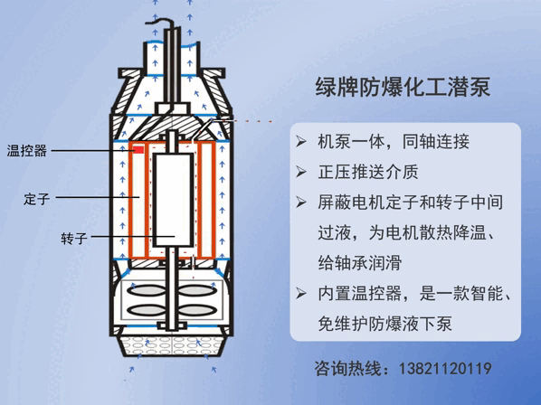 防爆化工潜泵机泵一体,电机不正在液面上,而正在液面下,任务道理是将电机和泵一同浸入罐底,电机策动叶轮增压将物料推送到地面倾向。 潜泵内置温度局限器,过流、过热守卫、无液干转主动停机效用,安宁牢靠。防爆化工潜泵的输送道理是正压推送介质,管线内各部位均为正压,不会产活气阻,制胜了古代工艺负压抽吸抽不上来介质的瑕疵,从根蒂上杜绝了气阻征象,防爆化工属于樊篱离心式无密封泵,泵和驱动电机都被密封正在一个隔爆型外壳加浇封型充满环氧树脂的真空压力容器内,转子也正在樊篱套密封内,唯有静密封没有动密封,电机定子绕组正在樊篱套外周,直接使用电动机来驱动叶轮,可能做到正在任务中没有火花爆发,所以可能做到所有无流露。