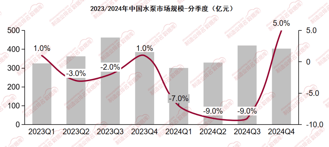 2024年整年四个季度来看,水泵市集体验了一个先降落后回升的经过,市集完全涌现出行业韧性和阶段性,并鄙人半年完毕伸长: