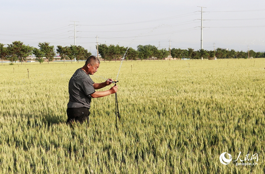 河南洛阳偃师区北窑村种粮大户王松涛正正在检修喷灌配置。公民网记者 慎志远摄